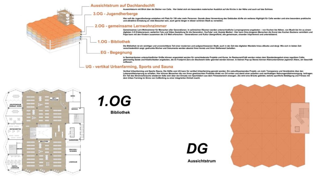 Anliegen und Ziel dieser Entwurfsidee ist es, diesem ehemaligen Kaufhausgebäude (Marktplatz Version 2.0), welches dem Leben in der Altstadt seit fast 60 Jahren eine markante Prägung gegeben hat, eine neue Attraktivität zu verleihen und es durch neue, zeitgemäße Konzepte zu einem belebten, interessanten und attraktiven Mittelpunkt des Stadtkern Celle zu machen. 2024. E.K.SØNG